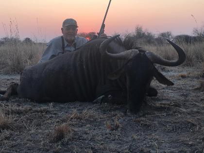 Wildebeest often graze in mixed herds with zebra which gives heightened awareness of potential predators. They are also alert to the warning signals emitted by other animals such as baboons. Males are larger than females and both have heavy forequarters compared to their hindquarters. They have broad muzzles, Roman noses, shaggy manes and tails. Today was a hard hunt in 95 degree weather that actually didn't even feel like it because of the lack of humidity. David was successful with a Wildebeest that we are going to make a rug with it. |