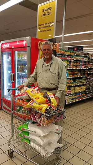 We stopped at a grocery store first to buy corn meal, fruit juice, and some treats. |